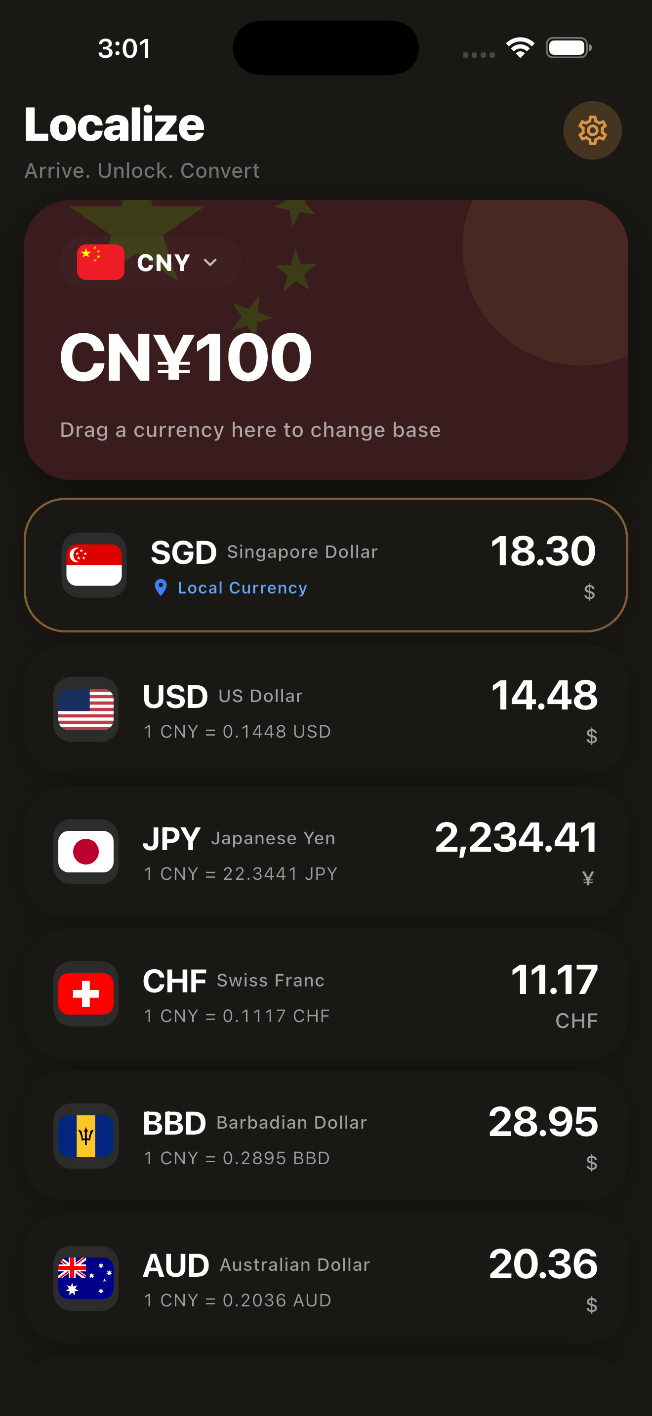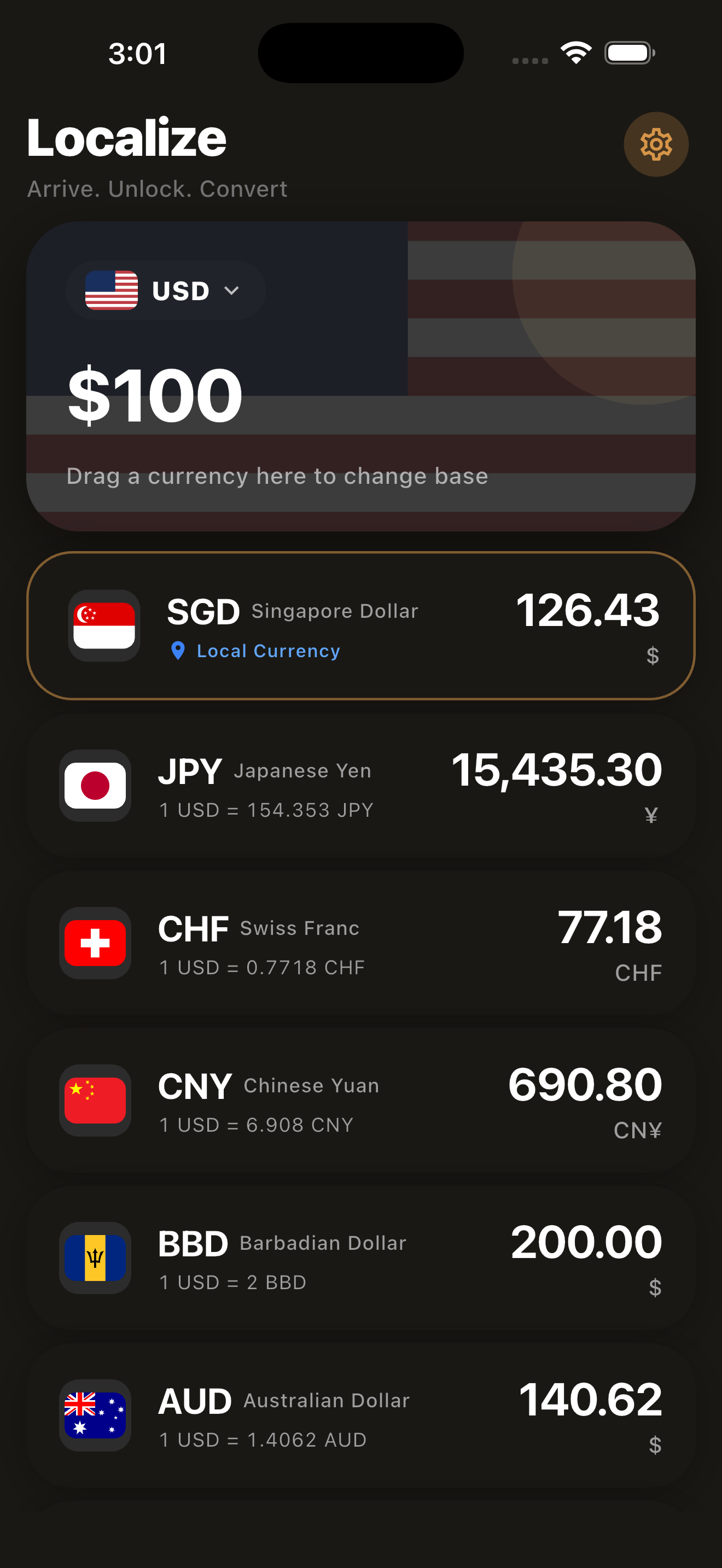 Localize automatically sets your local currency the moment you land, so conversion is ready before you type.